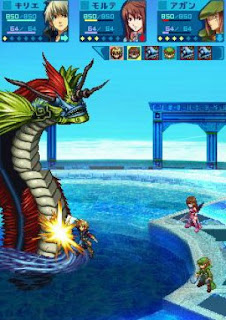 Bueno, una vez hechas las presentaciones, pasaremos a la jugabilidad del título. Al igual que pasaba con Nostalgia y otros tantos JRPG, Sands of Destruction hace uso de la típica estructura pueblo-mazmorra que se repetirá a lo largo de toda la aventura, solo que en esta ocasión no viajaremos por el mapa, sino que utilizaremos un mapamundi para seleccionar nuestro destino y trasladarnos directamente hasta él. En los pueblos podremos realizar las típicas acciones de descansar en las posadas, comprar objetos/armas y hablar con los habitantes. Una vez nos hayamos avituallado como es debido, será la hora de adentrarse en las laberínticas mazmorras del juego, las cuales estarán repletas de tesoros, y enemigos y jefes a los que deberemos derrotar para poder seguir avanzando en la aventura. Por desgracia para muchos, y suerte para otros tantos, como el buen JRPG clásico que es, Sands of Destrcution hace uso del clásico sistema de combates aleatorios, lo cual quiere decir que, cual topo, nuestro personaje será incapaz de ver a los enemigos mientras exploramos las mazmorras aunque estén a dos palmos de sus narices, así que cada cierto número de pasos el juego nos trasladará a la pantalla de combate donde tendrán lugar los combates del juego. Pero tengo buenas noticias para los detractores de este sistema, y es que el equipo de desarrollo se ha esforzado para intentar hacer que este sistema sea tan dinámico como sea posible (dentro de sus obvias limitaciones), así que no tiréis la toalla... o por lo menos no aún. Sands of Destruction hace uso de un sistema de combates por turnos en el cual los personajes actuarán por orden, siendo los personajes con el atributo de habilidad más alto los primeros en actuar. La pantalla de combate estará divida en dos partes, así tenemos que mientras que en la pantalla táctil inferior podremos ver a los enemigos terrestres, en la pantalla superior aparecerán los enemigos aéreos. Una de las cosas que ayudan a diferencia y dar personalidad al sistema de combate de Sands of Destruction será el sistema de puntos de batalla. Cada personaje contará con ciertos puntos de batalla en cada turno, y cada una de las acciones que podrá realizar consumirá una cantidad distinta de puntos de batalla. Contra más poderoso sea un ataque, más puntos de batalla consumirá, y viceversa. Cuando los puntos de batalla del personaje lleguen a cero, el personaje no podrá realizar más acciones hasta su siguiente turno. En cada turno los personajes podrán realizar ataques débiles que podrá enlazar para llevar a cabo combos, ataques fuertes, utilizar objetos y técnicas especiales/hechizos, o intentar huir. Cada vez que realicemos un ataque crítico o un combo de 10 golpes o más, se nos concederán puntos de batalla extra que nos permitirán realizar más acciones con nuestro personaje durante nuestro turno. La verdad es que el sistema de combate es bastante original y dinámico, haciendo que los combates sean muy amenos para un sistema tan limitado como es el sistema por turnos, aunque como explicará más tarde, el sistema cuenta con sus fallos.
